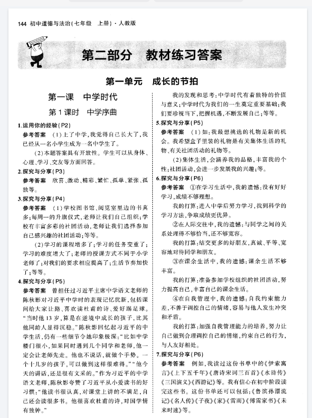 初中道法7-9年级《教材习题答案》」